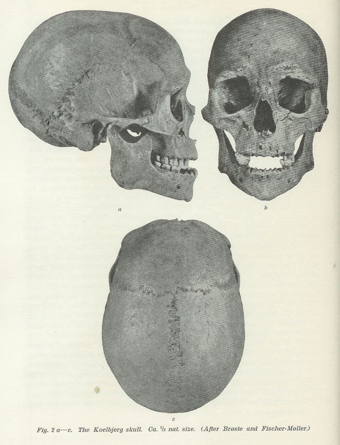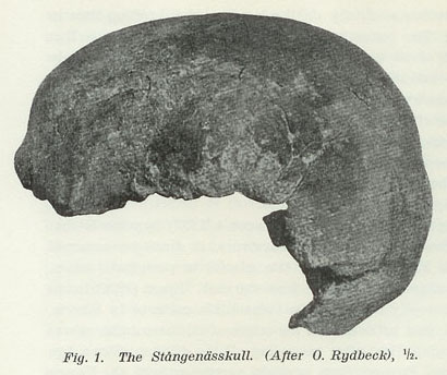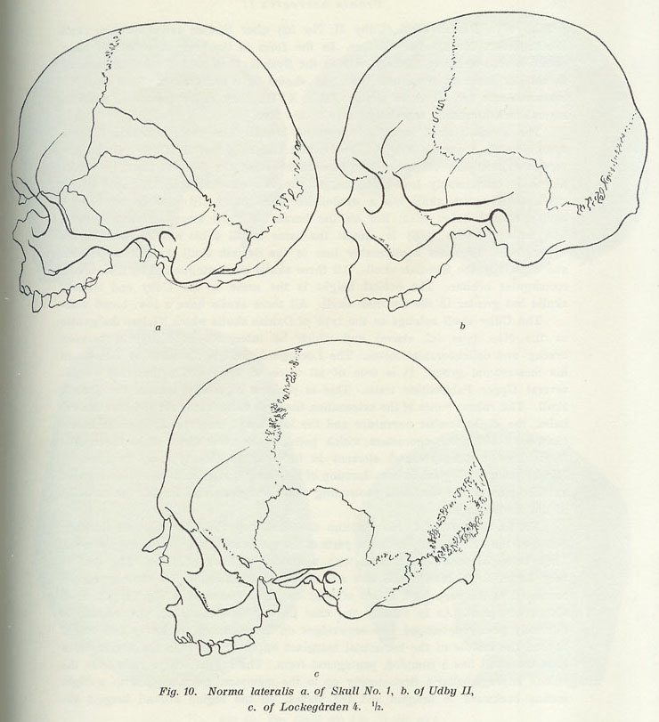 The Norwegian skeletal material from the Stone Age is very limited. If we confine ourselves to the skulls which can be dated to the Stone Age with certainty, the total is only four, namely the skull from the Megalithic grave near Svelvik on the Drammensfjord, a branch of the Oslofjord (No. 1), the skulls from Kråkerøy near Fredrikstad, close to the border of Swedish Bohuslän (No. 1 a), the skull from the dwelling-site at Nyelv, Finnmark (No. 8) and the skull of the young boy from the dwelling-site at Viste, near Stavanger. The latter skull, because of its scaphocephaly (Fürst, 1909), has little anthropological interest and will therefore not be discussed in the present paper. In addition to the skulls mentioned there are 6 others whose dating to the Stone Age cannot be regarded as certain and which possibly date from the Early Bronze Age. To these belong the skull fragment from a cave-find at Kristiansund (No. 2), three skulls found within the city limits of Trondheim (Nos. 3, 4 and 5), two bog-finds from Trøndelag (Nos. 6 and 7) and the skull from Leka, likewise in Trøndelag (No. 9). An isolated consideration of this scanty and wide-spread material is of limited interest. It is only in connection with the archaeological findings in our country and with the more abundant skeletal material known from the Stone Age in the other Scandinavian countries and Middle Europe that it can make a contribution to the history and origin of the Norwegian people. It was long the general opinion among anthropologists and archaeologists that Norway, because of its peripheral geographical position, had been settled relatively late in the Stone Age by migration from the Danish and southern Swedish culture centers, and had only developed a characteristic arctic culture in the northern parts of the country, the “slate culture” as it has been called, which has been ascribed by many to the Lapps. Archaeological investigations during the last few decades have revolutionized our opinion on these matters and have revealed that the earliest settlement of Norway must be placed much farther back in time than previously assumed. This result is due chiefly to the investigations of the Norwegian geologist and archaeologist A. Nummedal. In 1909 -10 Nummedal made a number of finds of flint in Kristiansund on the coast of Romsdal, which represent the oldest human culture vestiges in this part of the country. The culture which has been designated the Fosna culture, is a coast culture with flint as its main material. With the continued investigations of Nummedal and others the extent of this culture could be followed from Glesvær south of Bergen to Tysfjord in Nordland. It has not been found farther south or north along the coast, but turns up again in the Oslo district and Østfold with finds which show connection to the Fosna culture. There has been and still is a difference of opinion among archaeologists both as regards the dating of this culture and its relation to other cultures. Nummedal himself assumed at an early date that is was contemporaneous with the Danish Maglemose period and thus dated back to about 6000 B. C. Later investigators, emphasizing the archaic character of flint industry, have claimed even greater age, while others regard it as younger and contemporaneous with the Kitchen-midden culture. This disagreement as to dating may be partly due to the fact that the Fosna culture has extended over a very long period of time, according to recent investigations from a time before the Ancylus period into the period of the passage-graves. As regards the question of the origin of the Fosna culture and its relation to other cultures, two main interpretations have been set forth. According to one of these the Fosna culture is a later, southern continuation of the Komsa culture (see below) and has thus extended from the coast of the Arctic Ocean southward. According to the other interpretation it has, on the contrary, come from the south and spread northward along the coast. According to G. Gjessing (1945) the relation between the Ahrensburg culture and the Fosna culture is “an ascertained fact”. Like the former and the parallel Lyngby culture it must be assumed to have its origin in the Upper Palaeolithic Polish Swiderian. Even more interest, if possible, than that aroused by the discovery of the Fosna culture was caused by Nummedal’s investigations in Finnmark in the years from 1925—35 which led to the discovery of the culture which has been given the name Komsa culture after a particular locality, or, in connection with French archaeological nomenclature “Le Finnmarkien”. Like the Fosna culture, the Komsa culture is also characterized by implements of carved stones with a hard structure similar to flint without any admixture of slate. But the technique as well as the shape of the implements reveal a more primitive character than those of the Fosna culture and in details they are very like those of the Palaeolithic cultures in Europe. As Nummedal stated in his first report on the Komsa finds, they contain implements from practically all the periods from Mousterian to Magdalenian inclusively. It is also true of the Komsa culture that the dating presents great difficulties. Komsa dwelling-sites are usually located on ridges or terraces along the beach and like the Fosna dwelling-sites lie entirely above the surface so that dating must be based exclusively on the geologic evidence, chiefly on the level on the dwelling-sites in relation to the old beach level. The generally prevailing opinion at present is that the culture is postglacial and arctic and that the oldest finds belong to an early period of the melting of the inland ice after the ice had receded from the coast but still covered the entire country within the fjords. How long this period lasted is an unsettled question. Bøe (1936) is of the opinion that it was of relatively short duration and ended during the early part of the Maglemo