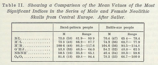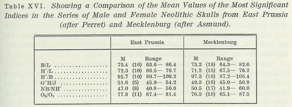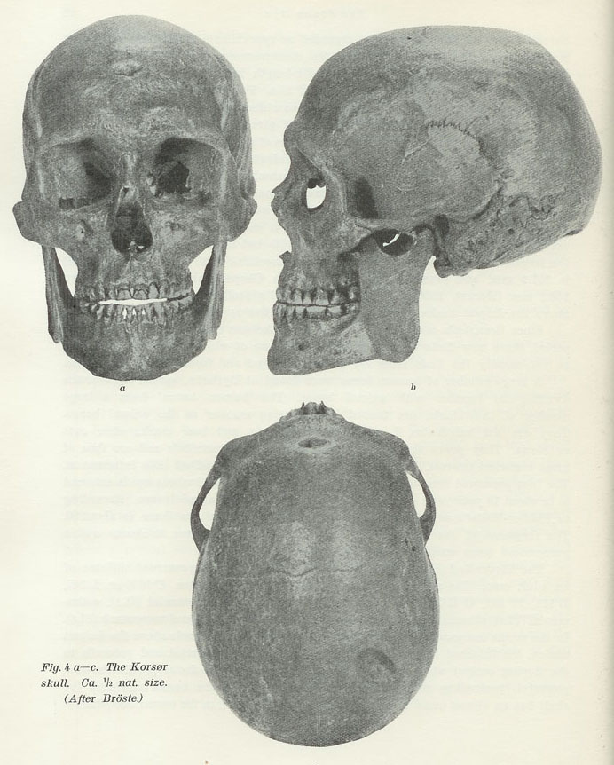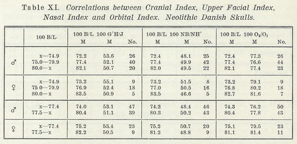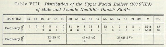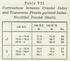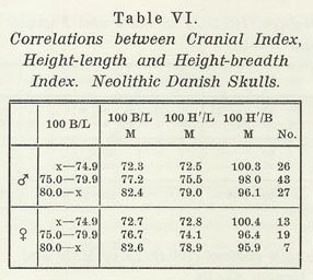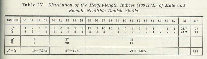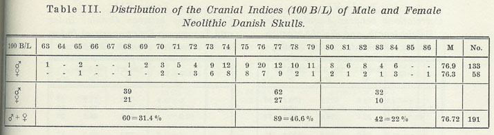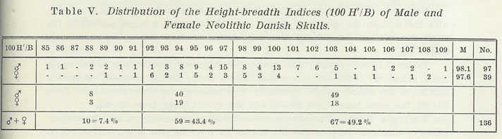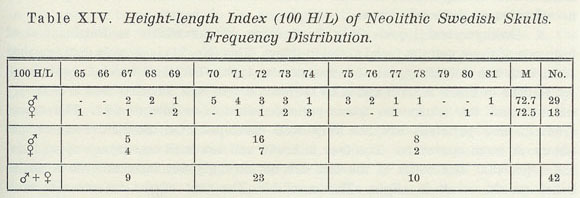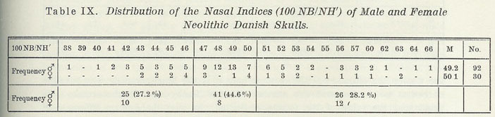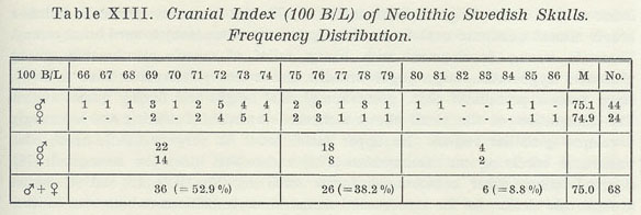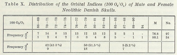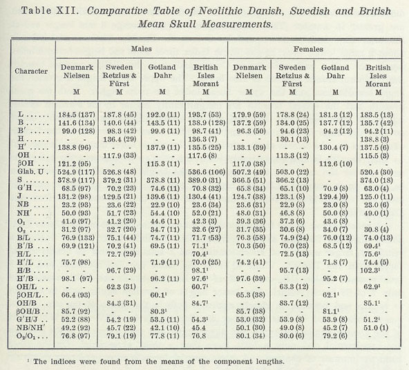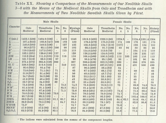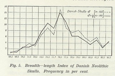 index are therefore considerably higher in the Stone Age material. In their malar facial index the Stone Age skulls differ little from the Medieval skulls, while the orbital index in both males and females is lower, principally due to a smaller orbital height. Our earlier investigations of Norwegian skull material from the Middle Age led to the result that the Oslo material as a whole belonged to the Nordic type. The material from Trondheim also undoubtedly included numerous representatives of this same skull form. However the explanation of the smaller size and more delicate structure which characterized this material as a whole was an open question. It is possible that the above-described skulls from Trøndelag's Stone Age may provide the explanation. Their entire structure is very like that of the Mediterranean type and exhibits no marked Upper Palaeolithic traits as do the previously described skulls Nos. 1—3. As is known, the Mediterranean skull form exhibits such great similarity to the Nordic that in individual cases it can hardly be distinguished from the latter except by its smaller absolute measurements and its more delicate structure, since both the calvarian and facial indices in both fall within the name range ef variation. Except for their higher orbital index and greater parietal breadth in relation te the length end height, the Medieval skulls from Trondheim differ in their indices only slightly from the Oslo skulls. However they differ from them markedly in their smaller absolute measurements and in this they agree with the Stone Age skulle from Trøndelag as mentioned above. This peculiarity of the Trondheim skulls may be explained by the assumption that there is stronger Mediterranean admixture than in any other hitherto examined Norwegian material. The above described skulls from Trøndelag's Stone Age indicate that this admixture dates back very far. The isolated position of the Trondheim material in relation to southern and western groups, compared with the occurrence of similar forms in Sweden and the previously mentioned (pp. 29—30) archaeological demonstration that the Swedish Stone Age culture spread to Norway via two different routes, partly up over Bohuslän to the South-Eastern parts and partly over Middle Sweden to the Trondheimsfjord, suggests that the invaders who followed the northern route brought the above-described skull form to Trøndelag. It can be regarded as highly probable that this skull type originated in the Mediterranean area. It to possible that its appearance on the Scandinavian Peninsula has some connection wilh the immigration to Sweden of Megalithic peoples from the west, proof of which Montelius and Forssander claim to find in the structure of the cist-graves of Forssander's Skogsbo type (cf. p. 61). The assumption of Mediterrsneon admixture in the population of Trøndelag may possibly also explain certain traits in the somatology of the present population, in the first place their pigmentation. In contrast to the situation in most other parts of Norway, the dolicho-mesocephalics in Trøndelag are more seldom blonde than the brachycephalics, and the dolichocephalics more frequently have black hair than the meso-brachycephalics, just as brown and dark mottled eyes are related to a lower mean cephalic index then blue and light mottled. Of the five individuals from