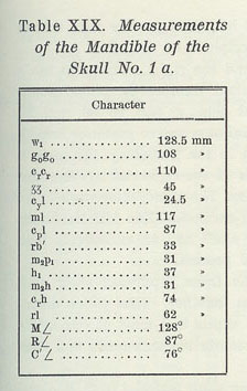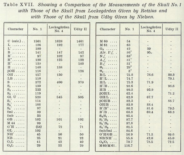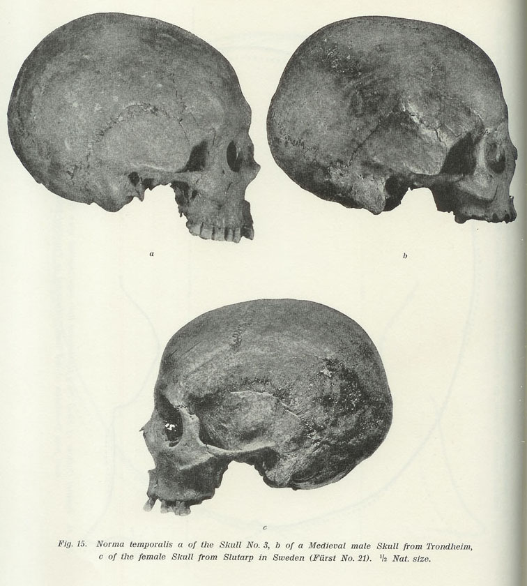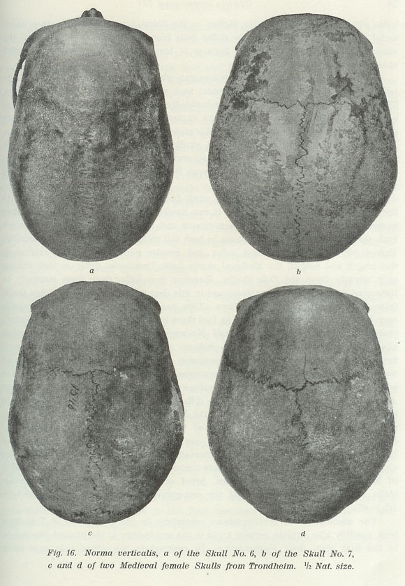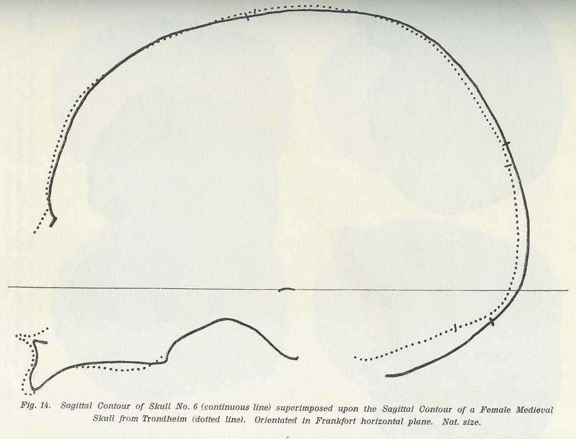 mastoidal breadth at 107 mm and the vertical auricular height at The left ramus of the mandible is defective and the right ramus also has a small defect at the everted gonial angle. The limited number of measurements which could be made were all taken on the right side: zz 46.5, rb' 36, m2p1 28, h1 82.5, m2h 27 mm, M /_123°, R /_73°, C' /_77°. The minimum antero-pesterior bradth of the ramus (rb') is greater in this mandible than in the preceding, the same is also true of the chord between the anterior margins of the right and left foramina mentalia (zz). The other lengths however are smaller. The mandibular angle (M /_) is also less, and especially the angle of the condylar-coronoidal line with the ramus tangent (R /_). which in the jaw of the preceding skull had no excessively high value beceuse of the extreme height of the coronoid process. Nos. 3—7. Plates III-VII. These five skulls from Trøndelag show such good agreement that it is natural to describe them together. That which distinguishes them both from the above-described three skulls and most of our skulls from the Bronze and Iron Ages, are their small absolute measurements end their smoothness. They represent a more delicate type. In the present author's investigation of Norwegian skull material from Medieval times it was emphasized that the skulls from Trondheim were distinguished from the skulls not only in the eastern provinces of the country, but also from most of the other Norwegian groups by their low means of the absolute measurements. Their capasity, arcs and linear measurements both of the calvaria and the face were considerably under those of most of the other groups. Only in the orbital measurements, especially the orbital height, did their means equal or exceed the others. It is remarkable that these skulls frem Trøndelag's Stone Age (or Early Bronze Age?) coincide with the Medieval material. In Fig. 13 the sagittal contours of skull No. 3 together with a male Medieval skull from the same city, are reproduced, in Fig. 14 the sagittal contours of the female skull No. 6 from the Leines March and a female Medieval skull from Trendbeim. In Figs. 15 and 16 some photographs of the Stone Age skulls are placed alongside of photographs of some Medieval skulls. Together with the figures in Plates III—VII these pictures give a good impression of the agreement. The female Megalithic skull from Slutarp in Västergötland which Fürst reproduces in his Plate XII and which is here presented in Fig. 15c shows greet similarity with our Trøndelag skulls. The metopic male skull of the same author on his Plate III from Mysinge on Öland is also close to the same type. The same is also true of the skull from Nyelv (No. 8) which will be described is mere detail below. Table XX gives a summary of the principal absolute measurements and indices for the skulls described here. For comparison the means for our Medieval skulls from Oslo and Trondheim are also recorded. Tho table illustrates tho above-mentioned differences in the absolute measurements between the Oslo and Trondheim skulls and shows the considerable agreement of the Stone Age skulls from Trøndelag with the Medieval material from Trondheim in this respect. Several of them even differ to a greater degree from the Oslo skulls than do the Medieval skulls from Trondheim. The Stone Age skulls have a somewhat lower cranial index than the means for the Medieval skulls. The male skulls agree in heigth-length index with the latter, while the female skulls, because of their greater absolute height, have higher values both for this index and for the height-breadth index. The minimum frontal breadth with the exception of the small female skull No. 6, is greater in the Stone Age skulls than in the Medieval skulls, while the maximum frontal breadth is less. Both the transverse frontal index and the traseverse fronto-parietal