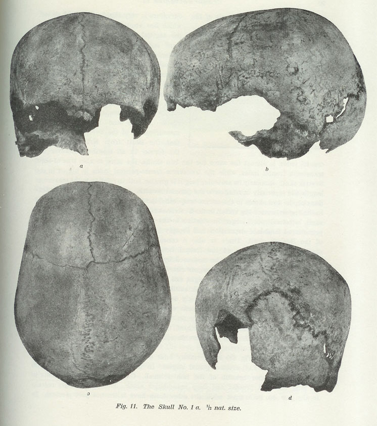 cm, calculated by the same method. In Table XX are presented the measurements which were possible of the skull cap together with the measurements of the Stone Age skulls from Trøndelag. It appears that the absolute measurements of the skull, with the exception of the auriculo-bregmatic height, are closer to the means of the Medieval skulls from Trondheim than to the means of the Oslo skulls. Its cranial index is somewhat higher than that of the Stone Age skulls from Trøndelag, but lower than the mean for the Medieval skulls from Trondheim, and like the Stone Age skulls it is distinguished by a high transverse fronto-parietal index, even though this, because of the greater parietal breadth, does not attain the same high value as in the Swedish skull from Mysinge. In its auriculo-bregmatic height the Nyelv skull agrees with the female skull No. 7. The considereble height also causes the computed capacity to be relatively high. The type similarity between the Nyelv skull, the Stone Age skulls from Trøndelag end certain Medieval skulls from Trondheim appears both from the sagittal contours which are reproduced in Fig. 11 and from the comparison of the photographs of these skulls. The skull cap from Nyelv is also of great interest in that it shows pronounced indications of trepanation and is the first specimen exhibiting evidence of thie surgical operation having been performed in Norway. In the right os parietale all the way into the sutura sagittalis and a little more than two cm above lambda there is a ca. 6 cm long and almost 4.5 cm broad depressed field with an irregularly formed hole in the center (Plate IX. Fig. 1). The field is broadest anteriorly. Farthest back a little of the sutura sagittalia is visible at the bottom of the field. Along the edge of the hole the bone is thin as paper, it increases gradually in thickness both forward and backward, so that here the field is only indistinctly limited from the surrounding skull roof. In toward the median line of the skull and outward toward the side, the thickness however increases more rapidly, and the difference in depth between the bottom of the field and the surrounding skull roof is therefore clearly marked. While the surface of the skull outside the field in smooth and has a yellowish brown color, within the field there are deep, branched vein furrows and between them numerous fine vein holes which penetrate the bone. The color is also lighter. While the field gradually grows narrow posteriorly, it spreads out anteriorly to the sides. One centimeter to the left of the sutura sagittalis there is an oval, 2.4 cm long and half as wide, very shallow depression in the left os parietale. The bottom of this slight depression has a slightly darker color and in less shiny than the surrounding bone. Examination with a magnifying glass reveals that this is due to dense, small vein holes. The internal surface of the skull roof shows no more indication than the external of fracture. Corresponding to the depressed field on the external surface it shows a branching of the furrows after the art. meningica media which is stronger than on the other side. Along the median line there is also a denser accumulation of holes for the veins of the skull than both farther forward and backward (Plate IX, Fig. 2). Where the smaller depression in the left os parietale is clearly visible on the external surface of the skull, the internal surface shows no alterations. According to information received from Nummedal who exhumed the skull, the hole in the roof was originally smaller and round. During exhumation the very thin bone surface adjacent to the hole was partly broken. Both the form and structure of the part of the skull described above definitely indicate that this in a case of trepanation. The operation wan performed with the name scraping technique which is known from several prehistoric trepanations in our neighboring countries, especially in Denmark, and on the South Sea Islands. Judging by the form of the trepanation field we can conclude that the scraper was wielded from the right front obliquely backward and inward to the median line. The patient probably lay on his back with his head in the operator's lap. The peculiarity of this trepanation is that the trepanation hole in any case was small in relation to the size of the field of the skull roof which is scraped down to the tabula interna. It is obviously impossible to have any correct notion of why the hole was not made larger. It may be that the operator was afraid of injuring the brain, and there in also the possibility that the patient, at this stage of the operation, refused to have the treatment continued. But it is also possible that the aim of the operator was to perform an operation more like that of the known scarification (T-sincipital) from France's Neolithic than like the true trepanation. Similar cases of incomplete trepanation in connection with scarification have also been encountered in French skulls. According to the structure of the bone in the hottom of the scraped area it can be concluded that the patient lived for quite a while after the operation. The deep vein furrows and the numerous vein holes in the scraped area show that the operation wan followed by a considerable reactive inflammation. The increase in the arterial furrows on the inside of the scraped area near the midline shows that the dura mater was also inflamed. The development of such deep vein furrows as those seen in the bottom of the field shows that the inflammation was of a high degree and was chronic. The depression found on the surface of the skull in the left parietal bone is probably due to the fact that the operator began here but for some reason or other gave up and chose the other side. The form and surface of the defect indicate that it is due to scraping. We cannot know the cause of the operation in this case. As mentioned above the skull shows no signs of fracture nor does it present any other 
