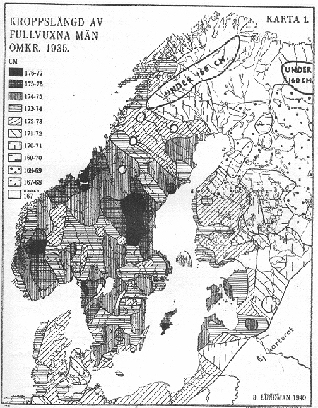 Tidigare funnos endast de ovanligt vackert utförda kartorna i L. o. L., ugjorda av prof. Sten De Geer. Då var ännu ej Flodströms viktiga sammanställning tryckt likaså ej heller arbeten av Bryn-Schreiner, Aul m. fl. För det nu utmärkt väl undersökta Estland fick de Geer nöja sig med en gammal slarvig rysk militärstatistik från 1880-talet (med t. ex. fel av över en tum på medeltalet för Ösel!) dessutom har de Geer generaliserat ytterst olikformigt samt här och där fantiserat rätt ohejdat t. ex. över raskaraktärerna inom de då alldeles oundersökta svenska finnmarkerna. - Vid utarbetandet av mina kartor har jag själv genomgått praktiskt taget alla originalpublikationer som beröra Nordens och dess grannländers rasförhållanden. De olika kartornas noggrannhet och tillförlitlighet är genom materialets olika beskaffenhet rätt olika. Kartan över huvudindex torde få anses som så gott som överallt synnerligen tillförlitlig. Beträffande den något mindre detaljsäkra kroppslängdskartan se för övrigt nedan. Den över ögonfärgen är nog också bra (möjligen är ögonfärgen i Danmark angiven en hårsmån för mörk). Däremot är hårfärgskartan sämre, genom olikformigheter och svårigheter vid de olika undersökarnas bedömning av hårfärgen. Karta 1 över kroppslängden är byggd på ett material på över 500,000 man. Hänsyn har tagits till kroppslängdsökningen så att jag tror att materialet överallt är fullt jämförbart. Vid första anblicken ser man huru kroppslängden är störst i mellersta Skandinavien, märkvärdigt nog dock mer i dess yttre delar än i de allra innersta. Karta 2 anger huvudformen efter över 150,000 uppmätningar. Här ha vi nu de längsta huvudena liksom på förra kartan de längsta kropparna i mellersta Skandinavien, här dock utan det nyss nämnda undantaget. Karta 3 och