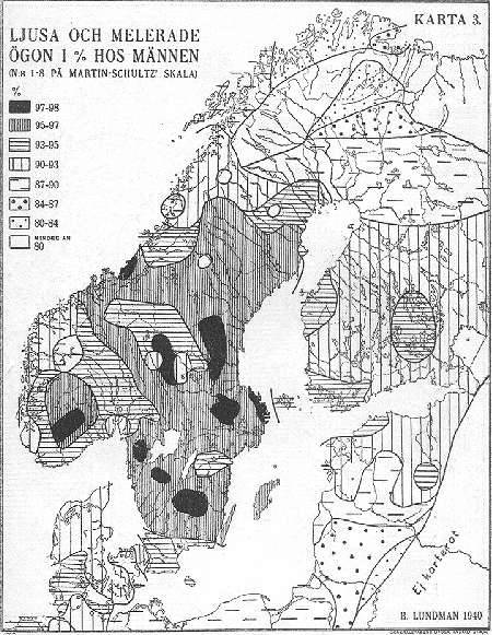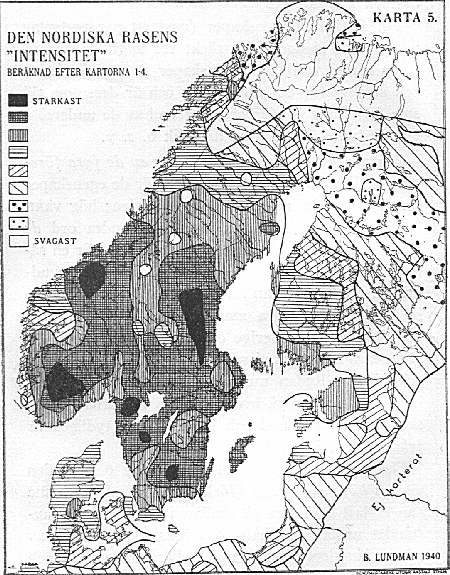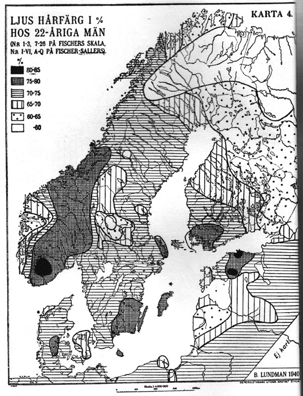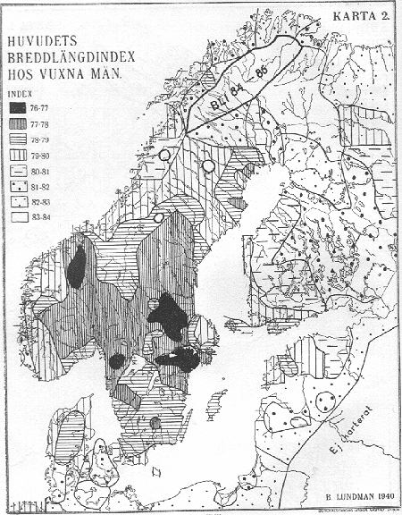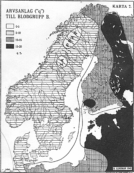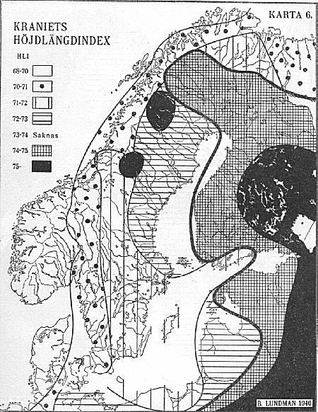 4 över ögonförg och hårfärg visa ock samma mellanskandinaviska maxima, här för ljusa färger, liksom på karta 1 ha vi dock sekundära minima längst inne. Karta 5 är en sammanfattning av de fyra föregående. Den är en intensitetskarta för de egenskaper som tydligen ha maxima i Skandinavien; hög växt, långskallighet och ljusa färger, med andra ord de traditionella nordiska dragen. Naturligtvis blir en sådan karta mycket schematisk men visar dock huvuddragen rätt noga. Man ser tydligt såväl det oss redan så väl bekanta stora maximet, omfattande nästan hela inre Mellan-Sverige och Södra Norge, och det sekundära minimet i vissa gränsskogar mellan Sverige och Norge. Redan nu kan sägas, att detta senare knappt alls beror på inverkan från finnarna i finnskogarna i Värmland och Dalarna utan tydligen är från mycket äldre datum. Dessutom har uppgjorts en Karta 6 över den viktiga höjdlängdindex (förkortat H. L. I.)1. Denna kan endast beräknas på skallar, i det den utgör avståndet mellan nackhålet och hjässan i procent av största längden. Hög index innebär höga skallar och tvärtom (medeltalen ligga mellan 68-79). Kartan äro byggda på ett mycket mindre material - inalles endast några tusen skallar. Skallegruppernas ålder och fåtalighet betyder dock föga, ty dels är längdhöjdindex (se nedan!) en genom tiderna så ovanligt konstant karaktär, dels komma motsättningarna utan undantag tydligen mycket vackert och regelbundet fram. Även en Karta 7 över de s. k. blodgrupperna har uppgjorts. Den angiver anlagen ("q") till blod-grupp B i procent av anlagen till samtliga blodgrupper. B-gruppen har sin största frekvens i Mellan-och Sydasien och avtager i Europa i stort mycket regelbundet från öster till väster. Här i Östersjöländerna är dess större frekvens (utom hos lapparna, där förhållandet är precis det omvända!) knuten till de mer högskalliga, östbaltiska områdena. I Finland ha även individuellt just de ostbaltiska typerna i medeltal den största B-gruppen. För övrigt ser man där samma förhållande som mest annars: Ringa skillnad mellan Finlandssvenskar (q c. 11) och västfinnar (c. 12, 5), större såväl mellan de förra och rikssvenskarna (c. 7, 5) som mellan de senare och östfinnarna (c. 16)! Ålänningarna (c. 9) stå dock närmast rikssvenskarna. Noter: