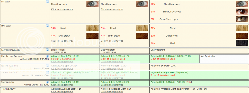 Seeing as people here are more interested in physical anthropology i'll include pigmentation but not all the medical data. It's interesting though, me and my dad get resistance to Norovirus from my paternal grandmother. And various other interesting things.