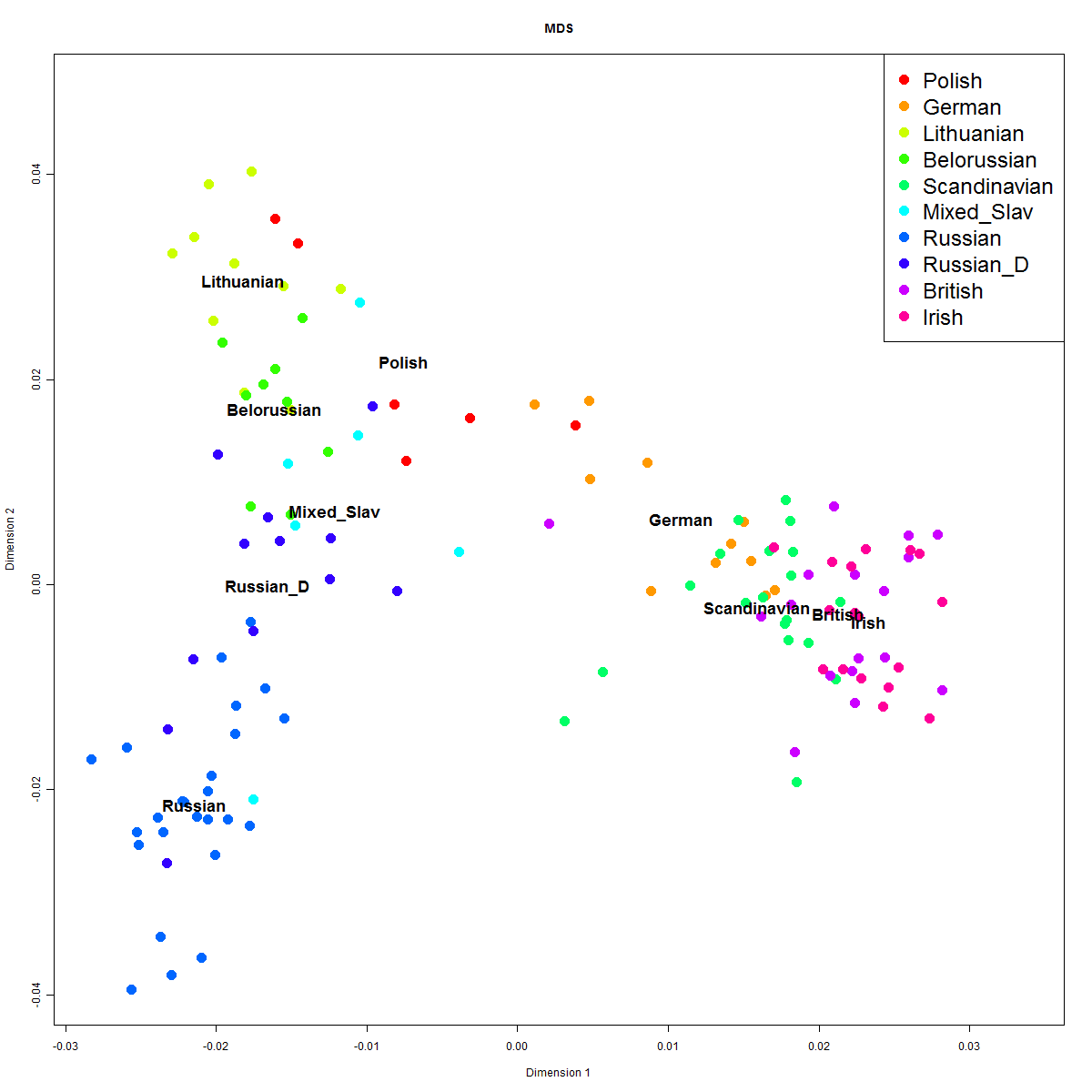 Here is a spreadsheet of Clusters Galore analysis with Dodecad populations: 692 reference individuals + 261 Dodecad Project participants from 24 different populations with at least 5 members each:Assyrian, Scandinavian, Greek, Finnish, S_Italian_Sicilian, Ashkenazi, German, Indian, Portuguese, Armenian, Russian, Spanish, British, Irish, Turkish, N_Italian, Balkans, Iranian, North_African, East_African, French, Chinese, Japanese, PolishAs a reminder to new readers, the Clusters Galore technique consists of applying multidimensional scaling on genomic data to convert ~152,000 SNPs into a number of continuous dimensions capturing most of the variation, followed by employment of MCLUST to cluster individuals along these dimensions.