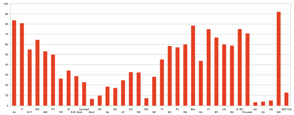 All countries with settlements of the Celts. Obviously the US includes a lot of people with western European heritage. I quite like this top ten, it screams CELTIC! Not a Germanic in site!