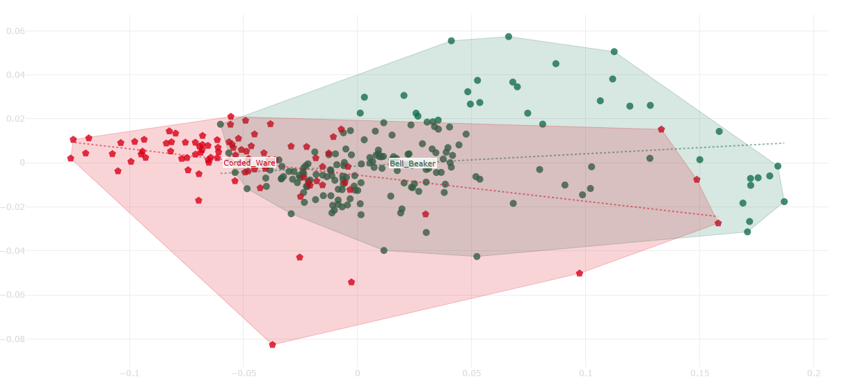 I could have done some screening by eliminating the overlapping samples to better show the difference between one group and another, but the reality is that there are European areas where both cultures coexisted, and I preferred to simply eliminate ouliers and contaminated samples, and let the rest as they are labelled (by his culture, and not by their "genetic tendency" showed in a PCA).