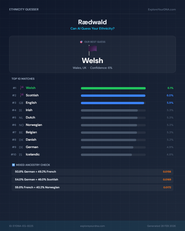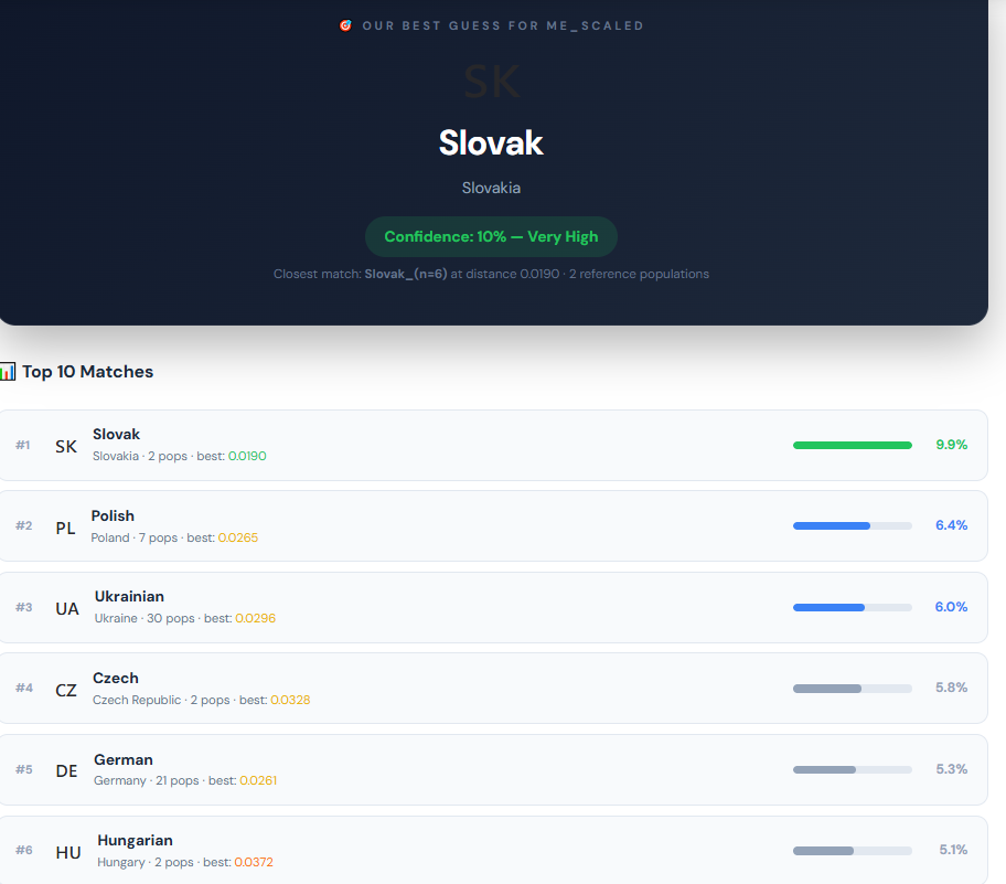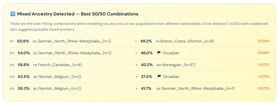 These are the best-fitting combinations when modeling you as a mix of two populations from different nationalities. A low distance (<0.015) with a balanced ratio suggests possible mixed ancestry.