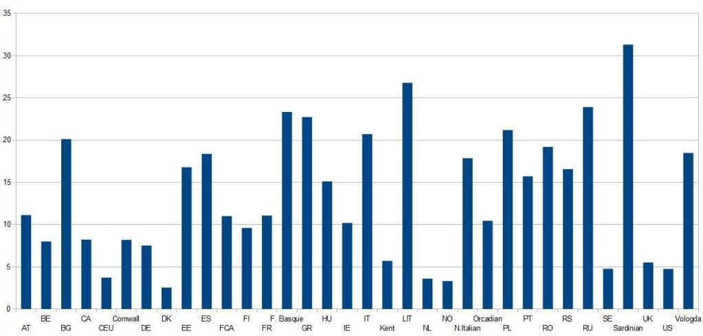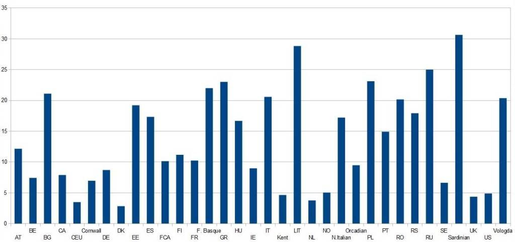 I made an experiment by merging the Dodecad v 2.1 results with those of the euro7 calculator of Dodecad, by adjusting the West_European and East_European elements based on the proportions of Northwestern and Northeastern in euro7.
