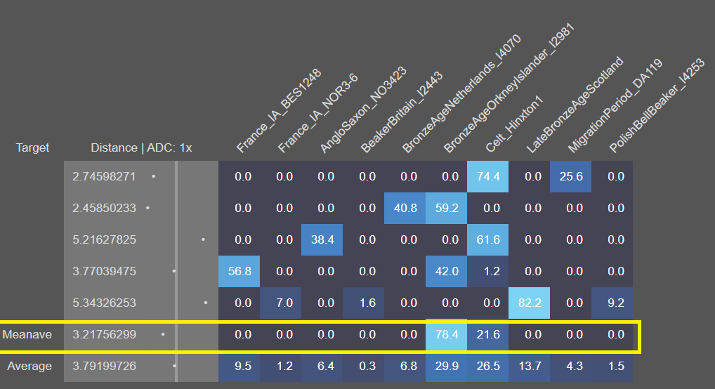 [9,] "59.9 % Central_Greek + 40.1 % Dharkar" "2.5033"