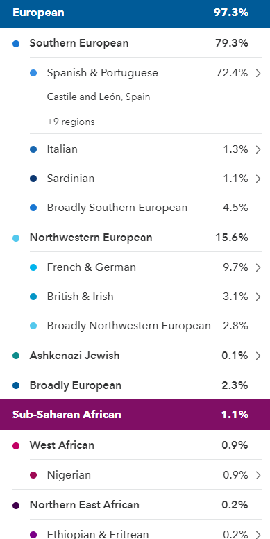 Eu testei o meu pai também, portanto os meus resultados foram faseados com os dele. Se todos os membros Ibéricos daqui testassem ambos os pais, de certeza que ficariam próximos de 100% Ibérico porque o 23andMe baseia-se nos antepassados dos últimos cinco séculos (e provavelmente 95% dos Portugueses e Espanhóis não têm antepassados estrangeiros nos últimos cinco séculos).