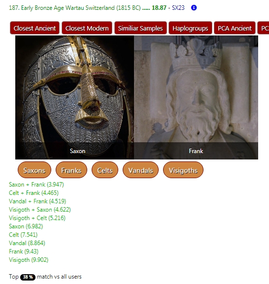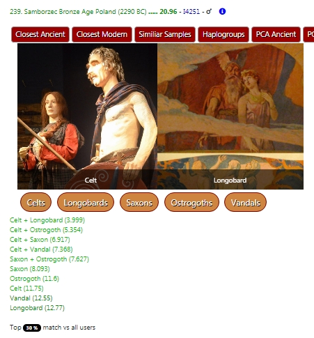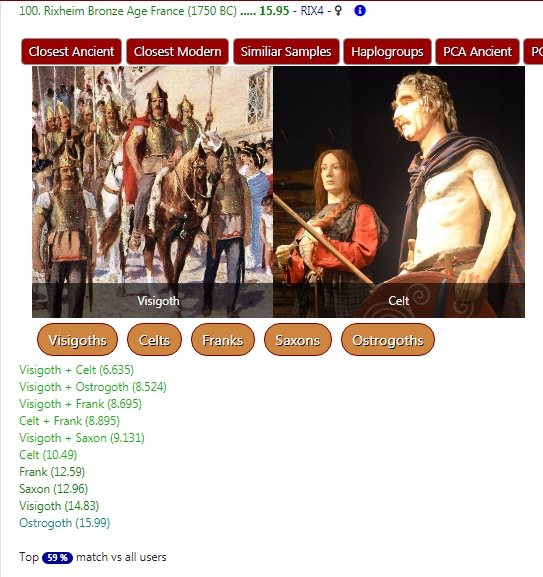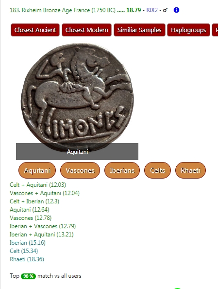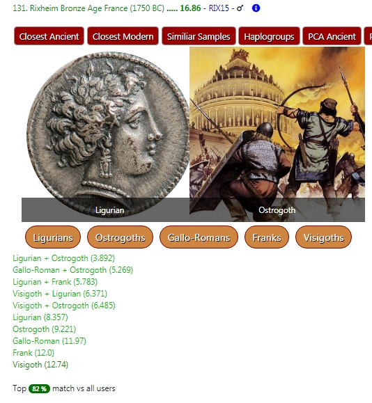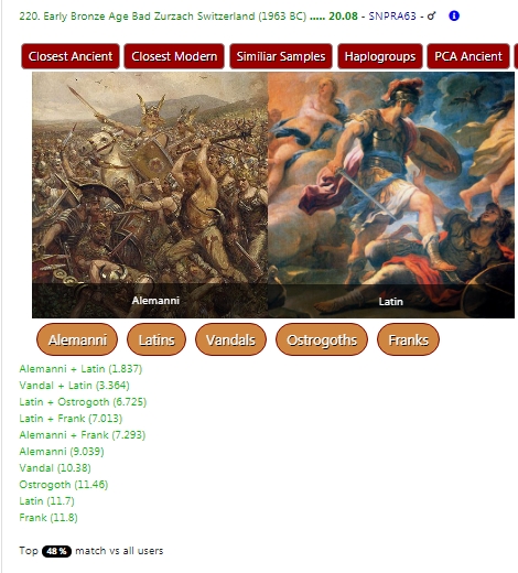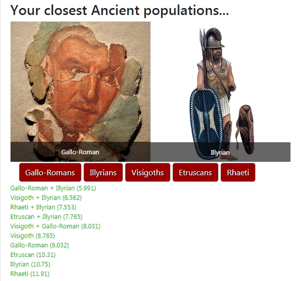 Early bronze age: Illyrian 59.4%, Proto-Rhaeti 7.4%, Proto-Vascones 7.1%, Etruscan 5.2%, Proto-Visigoth 5.6%, Proto-Iberian 5.5%, Proto-Gallo-Roman 3.6%, Latin 3.4%, Proto-Ostrogoth 2.6%, Phoenician 1.9%, Proto-Boii 0.9%, Proto-Frank 0.8%