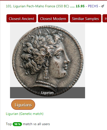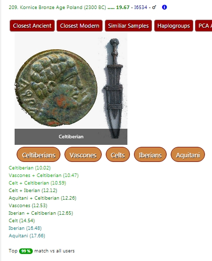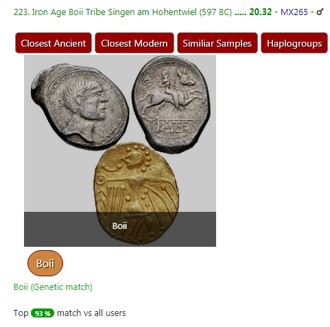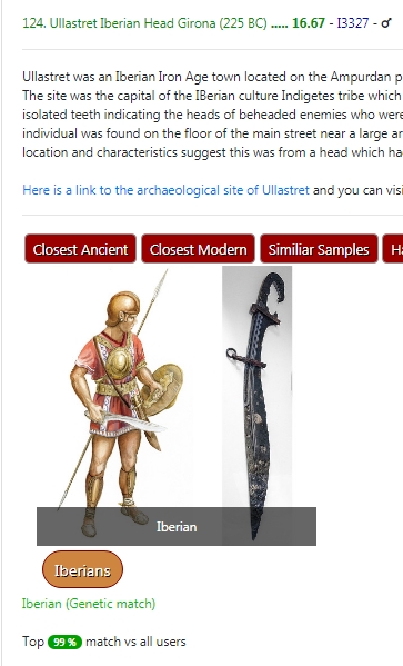 Iron age: Etruscan 23.3%, Iberian 20.4%, Vascones 14.6% , Phoenician 10.7%, Rhaeti 8.7%, Gallo-Roman 7.2%, Carthaginians 5.4%, Boii 5.3%, Illyrian 4.4%, Latin 4.1%, Gaul 1%