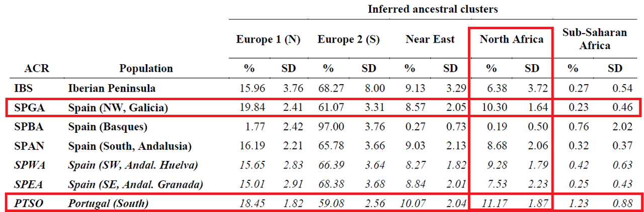 Mira Gixajo, otro q lo entiende. Se ve que el que no lo entiende eres tú. Es ridículo creer o inventarse esa frase de que hubo mestizaje también INCLUSO en zonas donde no hubo casi presencia musulmana. Es decir, por tus santas narices te inventas algo, y pretendes pontificar sobre ello, cuando es evidente que hay algo raro en este asunto, como he afirmado muchas veces, y como tb confirma Duffmann. Qué puede explicar que toda la cornisa cantábrica dé más ""Northafrican"" en España, SALVO QUE SEA UNA FALACIA porque el componente no sea norteafricano SINO PROTO-EUROPEAN. No sé si sabes gixajo que los norteafricanos actuales dan un 20-30% de Iberian. Para q veas q la política-ideología me la suda. Ese 20-30% DUDO que sea de las expulsiones de Al-Andalus. Es el mismo caso del NA en España, en realidad son elementos caucasoides comunes prehistóricos (los norteafricanos son parte caucasoide parte negra, etc). Qué casualidad q los q más iberian dan son los bereberes, sabiendo q sus halogrupos son europeos y q lo más probable es q los bereberes fueran una población europea que emigrara tras el refugio glacial a Africa. Esto lo confirma que sus halogrupos maternos son V, como los sami. Qué vínculo puede haber entre los sami y los bereberes?? El refugio glacial pirenaico seguramente. No me imagino a bereberes en Finlandia, ni a finlandeses en el Atlas. A esto se llama deducción, porque no hay crónicas escritas de la época, evidentemente.