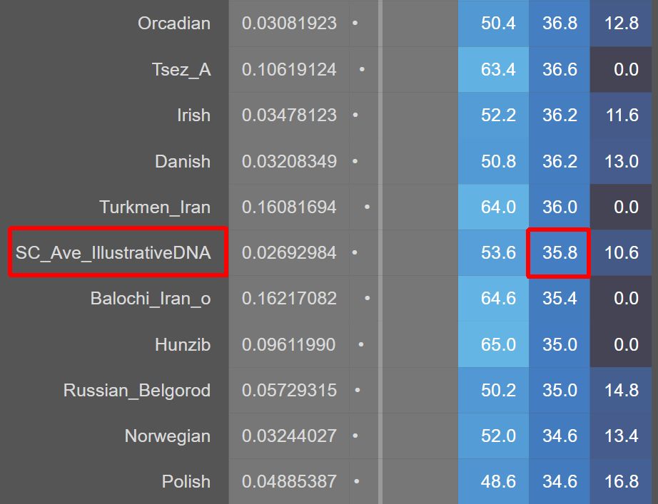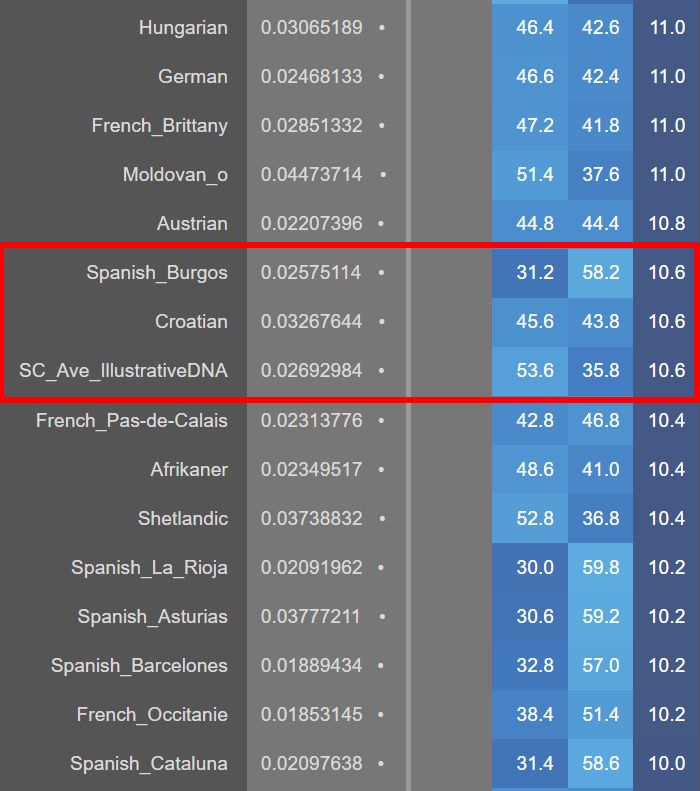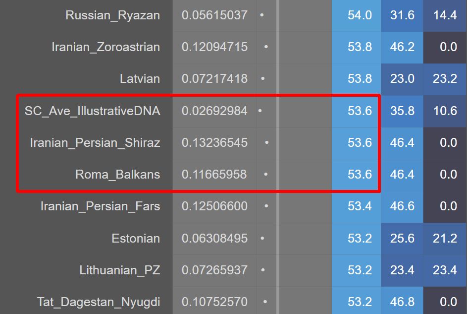 If I do a little East-West analysis it looks like I'm picking up more Yamnaya via Akhvakh, which get 69.8% Yamnaya, tilting me Eastward: