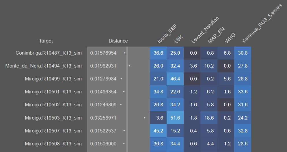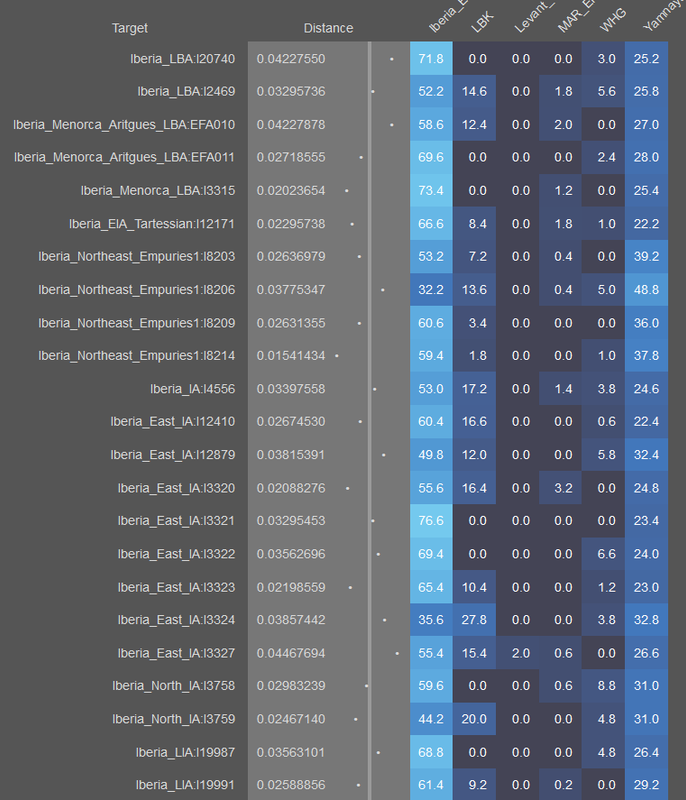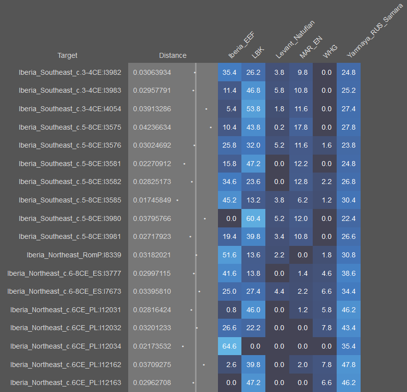 Western EEF dominates in pre-Roman samples, although some individuals also benefit slightly from LBK. The second group is the complete opposite, only a few of them strongly prefer the native EEF references, that includes the Visigothic samples and those with high East Med+North African. Naturally the Reconquista changed the scenario. Since north/central Spanish (Leonese and Castillians) derive more of their ancestry from pre-Roman Iberia, they will prefer Western EEF more strongly than Galician-Portuguese or Catalan speakers do. I think.