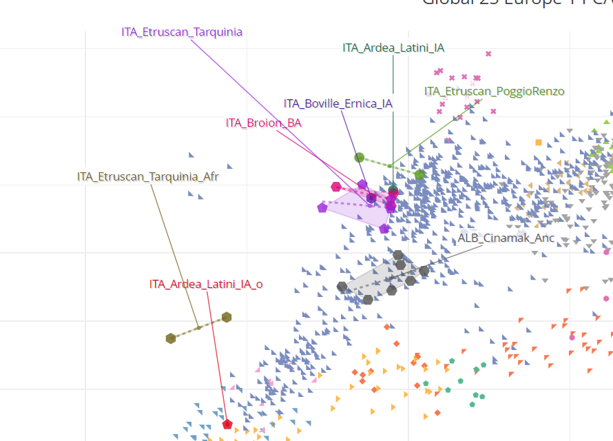 Iron Age Balkans was different from Iron Age Italy or Iberia, autosomally Iron Age Italy mainly overlapped with the Northern Balkans. Many autosomal overlaps are nothing but coincidences or due to contacts such as Liburnians, Histirans and Venetic were most likely not Illyrians. And we see Southern Europe shifts more east during Roman period. Many J2b2 and E-V13 we have from Roman period plot more East close to the modern Southern Balkan cluster (Albanian, Greek, Macedonian etc) and overlap with Eastern shifted Italians.