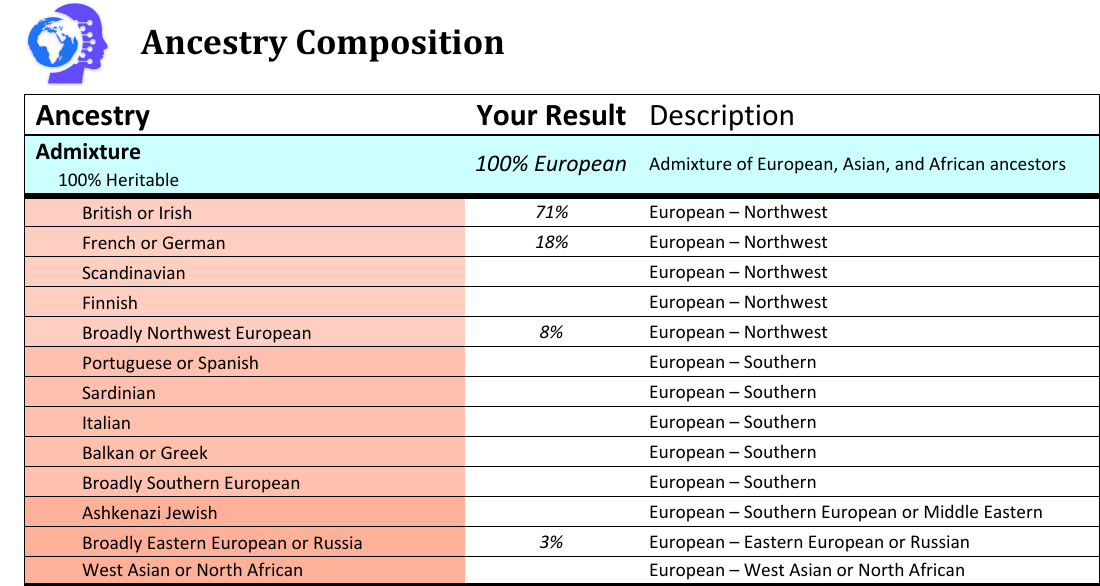 This one from sequencing.com says 100% Euro and actually says 3% Eastern Euro which could make sense due to Prussian/German ancestry and could explain why I sometimes cluster with the Dutch rather than the British :