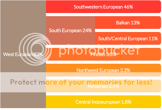 My east central euro, west caucasian and north caucasian are higher than yours. Maybe that represents my 10% of sephardic jew in my origins? :rolleyes: Also i have more northeast african. Interesting.