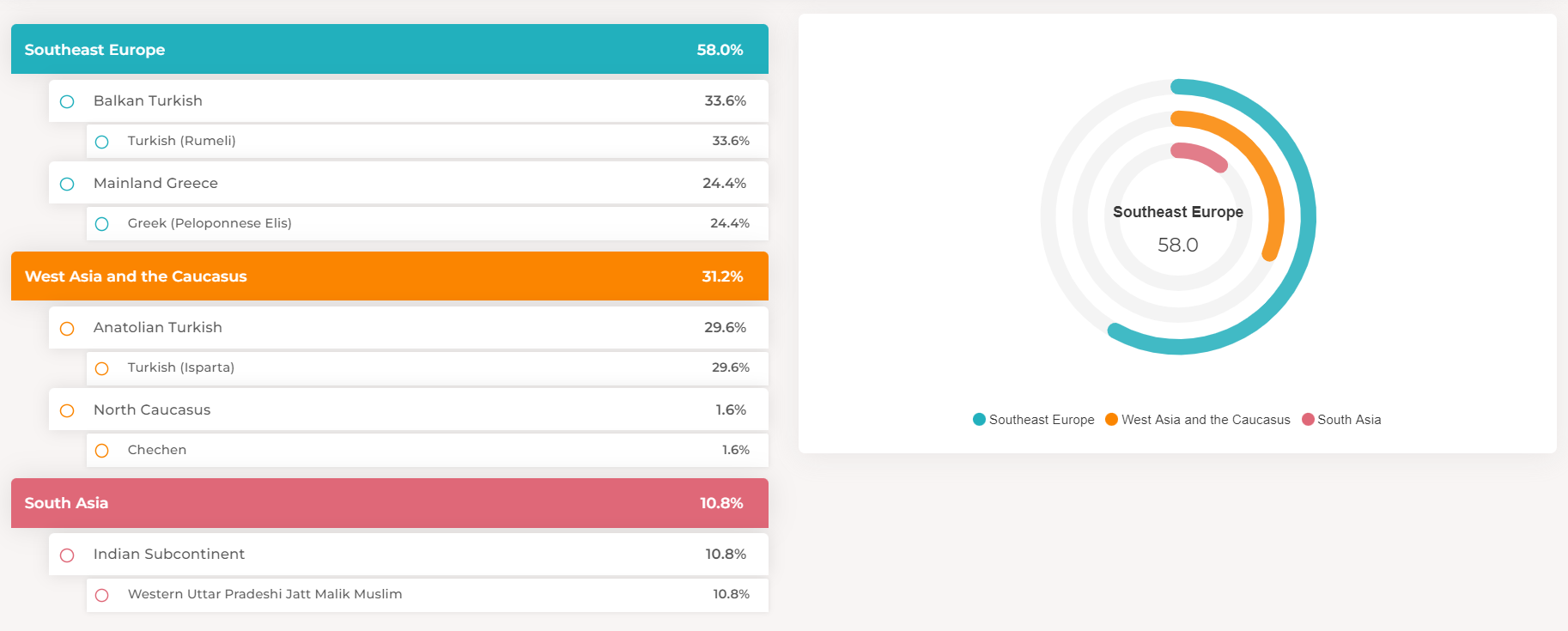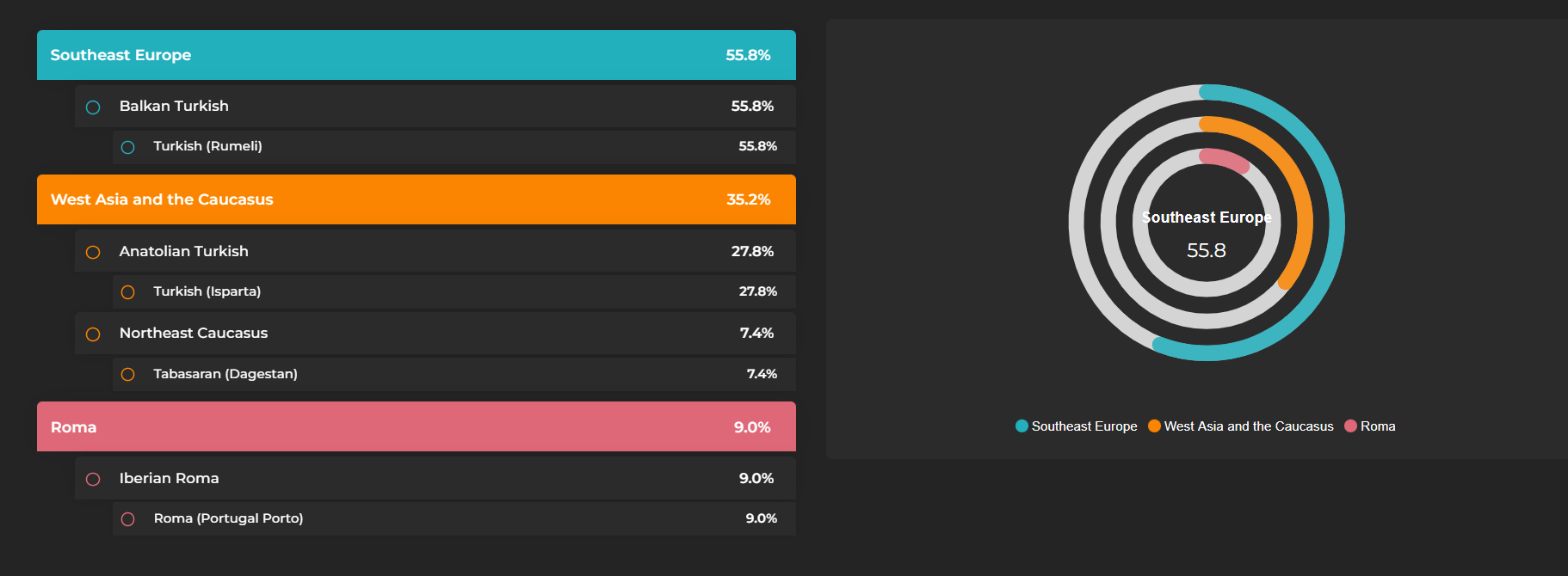 Eh I got this, seems it just picks the population groups that it can mix to match you closest. Balkan Turk for me makes sense but the other matches not really, I don't have any relatives outside of Marmara region of Turkey for atleast four generations, so the Isparta result doesn't really add up. My grandmother was atleast half-circassian so the Caucasus connection makes sense, but her circassian ancestry as far as I know traces to the Sochi region (who are extinct today), Tabasaran people are unrelated. The Iberian Roma result makes no sense at all, lol. How do you guys get to see these expanded statistics? All I get is a image.